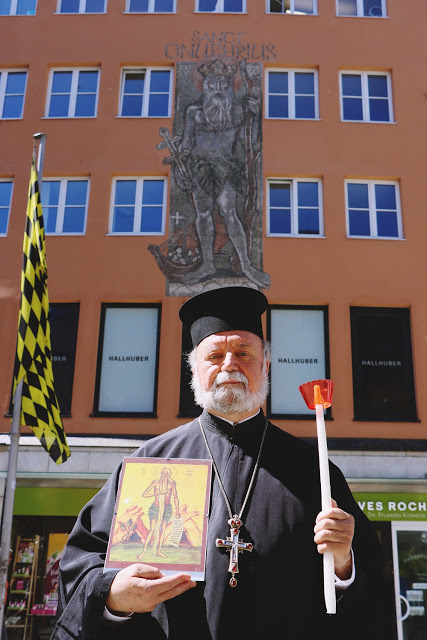 Με αφορμή τη φετεινή εορτή του αγίου ο Πρωτοπρεσβύτερος Απόστολος Μαλαμούσης μετέβη χθες (12.6.20) στην κεντρική πλατεία του Μονάχου, την Marienplatz και άναψε, μπροστά στην παράσταση του Αγίου Ονουφρίου, ένα κερί προς τιμή του. Στα χέρια του κρατούσε και την ορθόδοξη βυζαντινή εικόνα του Αγίου Ονουφρίου.