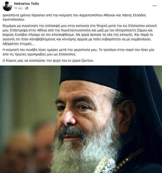 Με αφορμή την συμπλήρωση δεκαπέντε χρόνων από την κοίμηση του μακαριστού Αρχιεπισκόπου Αθηνών και πάσης Ελλάδος κυρού Χριστοδούλου, σήμερα, Σάββατο 28 Ιανουαρίου 2023, ο Σεβασμιώτατος Μητροπολίτης Χονγκ Κονγκ κ. Νεκτάριος με μήνυμα του σε μέσο κοινωνικής δικτύωσης θυμάται την επίσκεψη του στον μακαριστό Αρχιεπίσκοπο λίγες μέρες πριν την κοίμηση του