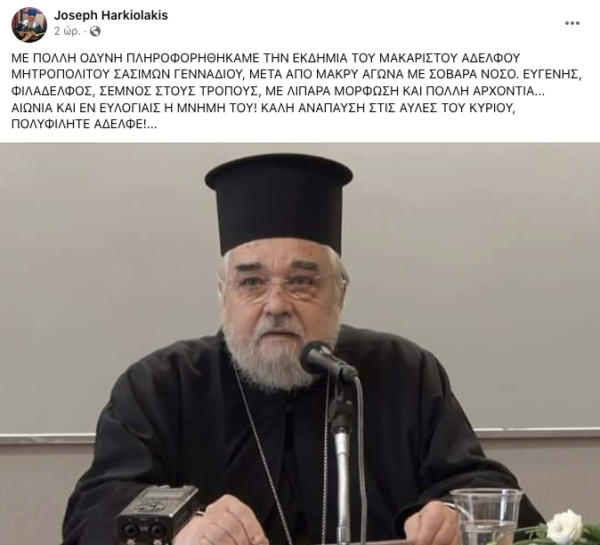 «ΜΕ ΠΟΛΛΗ ΟΔΥΝΗ ΠΛΗΡΟΦΟΡΗΘΗΚΑΜΕ ΤΗΝ ΕΚΔΗΜΙΑ ΤΟΥ ΜΑΚΑΡΙΣΤΟΥ ΑΔΕΛΦΟΥ ΜΗΤΡΟΠΟΛΙΤΟΥ ΣΑΣΙΜΩΝ ΓΕΝΝΑΔΙΟΥ, ΜΕΤΑ ΑΠΟ ΜΑΚΡΥ ΑΓΩΝΑ ΜΕ ΣΟΒΑΡΑ ΝΟΣΟ. ΕΥΓΕΝΗΣ, ΦΙΛΑΔΕΛΦΟΣ, ΣΕΜΝΟΣ ΣΤΟΥΣ ΤΡΟΠΟΥΣ, ΜΕ ΛΙΠΑΡΑ ΜΟΡΦΩΣΗ ΚΑΙ ΠΟΛΛΗ ΑΡΧΟΝΤΙΑ… ΑΙΩΝΙΑ ΚΑΙ ΕΝ ΕΥΛΟΓΙΑΙΣ Η ΜΝΗΜΗ ΤΟΥ! ΚΑΛΗ ΑΝΑΠΑΥΣΗ ΣΤΙΣ ΑΥΛΕΣ ΤΟΥ ΚΥΡΙΟΥ, ΠΟΛΥΦΙΛΗΤΕ ΑΔΕΛΦΕ!…»