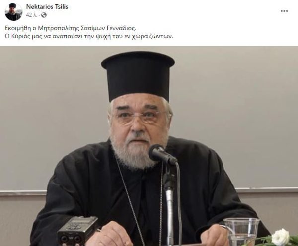 «Εκοιμήθη ο Μητροπολίτης Σασίμων Γεννάδιος. Ο Κύριός μας να αναπαύσει την ψυχή του εν χώρα ζώντων», αναφέρει ο Σεβασμιώτατος Μητροπολίτης Χονγκ Κονγκ και Έξαρχος Άπω Ανατολής κ. Νεκτάριος σε μήνυμα του σε μέσο κοινωνικής δικτύωσης για την εις Κύριον εκδημία του μακαριστού Μητροπολίτη.