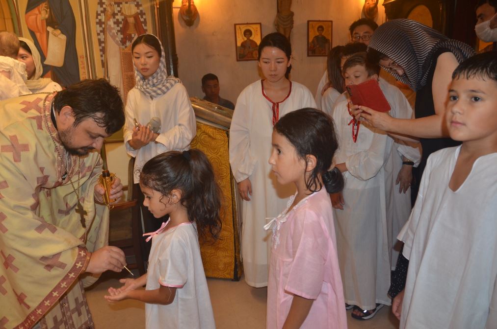 Μετά το Μυστήριο του Βαπτίσματος και του Χρίσματος και ψάλλοντας το «Ὅσοι εἰς Χριστὸν ἐβαπτίσθητε, Χριστὸν ἐνεδύσασθε, Ἀλληλούϊα» ήρθαν όλοι οι νεοφώτιστοι εν πομπή στον καθεδρικό ναό του Αγίου Νικολάου, όπου ετελείτο η θεία Λειτουργία, για να συμμετάσχουν στο Μυστήριο της θείας Ευχαριστίας.