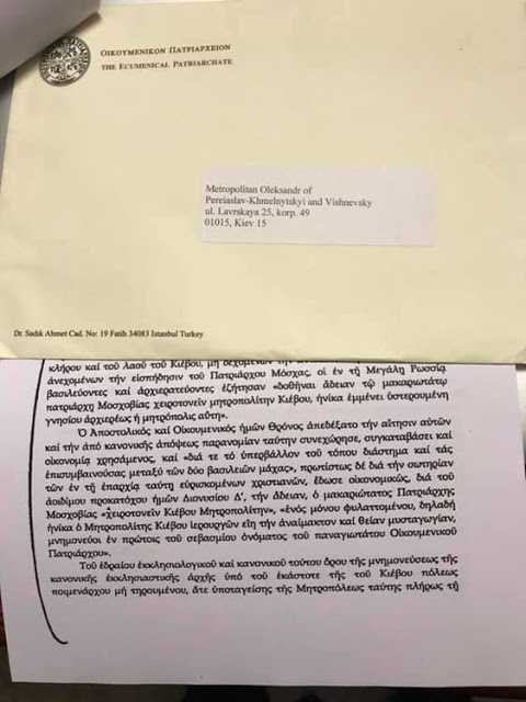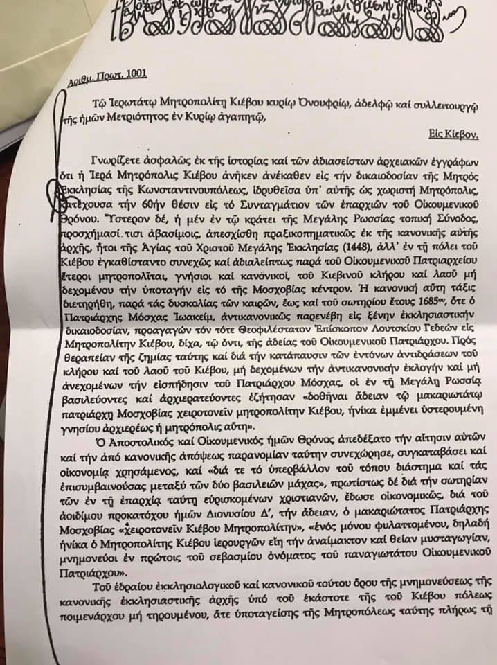 Ο Οικουμενικός Πατριάρχης Βαρθολομαίος απέστειλε επιστολή προς τον Μητροπολίτη Κιέβου κ. Ονούφριο, της δικαιοδοσίας του Πατριαρχείου Μόσχας.