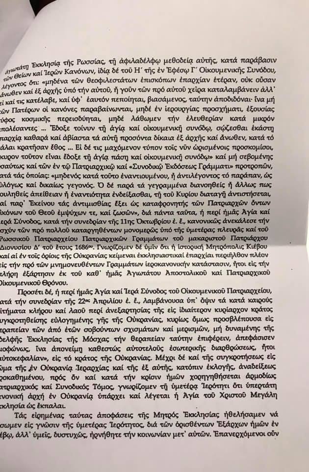 Είναι προφανές ότι με την κίνησή Του αυτή ο Πατριάρχης Βαρθολομαίος παραβλέπει, φιλανθρώπως, την ακοινωνησία με το Οικουμενικό Πατριαρχείο που έχει αποφασίσει η Εκκλησία της Ρωσίας και η υπ’ αυτήν Εκκλησία της Ουκρανίας, βάζει στην άκρη τις σκληρές εκφράσεις που έχει χρησιμοποιήσει και ο Κιέβου Ονούφριος για το Φανάρι και του απευθύνει έκκληση για συμμετοχή στην Αυτοκέφαλη Εκκλησία της Ουκρανίας.