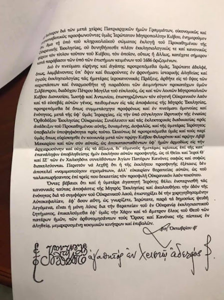 Μάλιστα ο Πατριάρχης θεωρεί πως ο Κιέβου Ονούφριος μπορεί “ασφαλώς” να θέσει υποψηφιότητα για την θέση του Προκαθημένου!