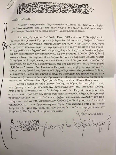 Ο Πατριάρχης καλεί και προτρέπει τον Κιέβου Ονούφριο να αρθεί στο ύψος των περιστάσεων και να συμμετάσχει «εις την υπό σύγκλησιν ιδρυτικήν της ενιαίας Ορθοδόξου Εκκλησίας Ουκρανίας Συνέλευσιν και τας εκλεκτορικάς διαδικασίας προς ανάδειξιν του Προκαθημένου αυτής, δυναμένης, ασφαλώς, και της υμετέρας Ιερότητος υποβαλείν υποψηφιότητα προς τούτο».