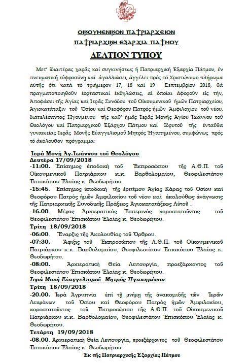 Μετ’ ἰδιαιτέρας χαρᾶς καί συγκινήσεως ἡ Πατριαρχική Ἐξαρχία Πάτμου, ἐν πνευματικῇ εὐφροσύνῃ καί ἀγαλλιάσει, ἀγγέλει πρός τό Χριστώνυμο πλήρωμα αὐτῆς ὅτι κατά τό τριήμερον 17, 18 καί 19 Σεπτεμβρίου 2018, θά πραγματοποιηθοῦν ἑορταστικαί ἐκδηλώσεις, αἰ ὁποίαι ἀφοροῦν εἰς τήν, Ἀποφάσει τῆς Ἁγίας καί Ἱερᾶς Συνόδου τοῦ Οἰκουμενικοῦ ἡμῶν Πατριαρχείου, Ἀγιοκατάταξιν τοῦ Ὁσίου καί Θεοφόρου Πατρός ἡμῶν Ἀμφιλοχίου τοῦ νέου, διατελέσαντος Ἡγουμένου τῆς καθ’ ἡμᾶς Ἱερᾶς Μονῆς Ἁγίου Ἰωάννου τοῦ Θεολόγου καί Πατριαρχικοῦ Ἐξάρχου Πάτμου καί Ἱδρυτοῦ τῆς ἐνταῦθα γυναικείας Ἱερᾶς Μονῆς Εὐαγγελισμοῦ Μητρός Ἠγαπημένου, συμφώνως πρός τό ἀκόλουθον πρόγραμμα: