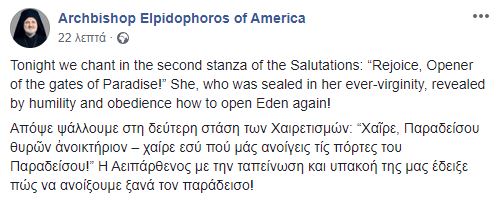 13/03/2020 13/03/2020 Επίκαιρη ανάρτηση του Σεβασμιωτάτου Αρχιεπισκόπου Αμερικής κ. Ελπιδοφόρου, όπου, καθώς αναφέρει: “Απόψε, ψάλλουμε στη δεύτερη στάση των Χαιρετισμών: “Χαῖρε, Παραδείσου θυρῶν ἀνοικτήριον – χαίρε εσύ πού μάς ανοίγεις τίς πόρτες του Παραδείσου!” Η Αειπάρθενος με την ταπείνωση και υπακοή της μας έδειξε πώς να ανοίξουμε ξανά τον παράδεισο!”. “Tonight we chant in the second stanza...