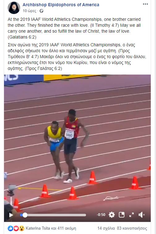 “Στον αγώνα IAAF World Athletics Championships, ο ένας αδελφός σήκωσε τον άλλο και τερμάτισαν μαζί με αγάπη” έγραψε ο κ. Ελπιδοφόρος επικαλούμενος τη φράση του Αποστόλου Παύλου στην προς Τιμόθεον Επιστολή “Tὸν ἀγῶνα τὸν καλὸν ἠγώνισμαι, τὸν δρόμον τετέλεκα, τὴν πίστιν τετήρηκα·” Και πρόσθεσε: “Μακάρι όλοι να σηκώνουμε ο ένας το φορτίο του άλλου, εκπληρώνοντας έτσι τον νόμο του Κυρίου, που είναι ο νόμος της αγάπης” παραπέμποντας στην Προς Γαλάτας Επιστολήν “ἀλλήλων τὰ βάρη βαστάζετε, καὶ οὕτως ἀναπληρώσατε τὸν νόμον τοῦ Χριστοῦ”.