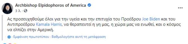 Σε ανάρτησή του ο Σεβ. Αρχιεπίσκοπος Αμερικής κ. Ελπιδοφόρος έγραψε: “Ας προσευχηθούμε όλοι για την υγεία και την επιτυχία του Προέδρου Joe Biden και της Αντιπροέδρου Kamala Harris, να θεραπευτεί η γη μας, η χώρα μας να ενωθεί, και ο κόσμος να ελπίζει στην Αμερική”.