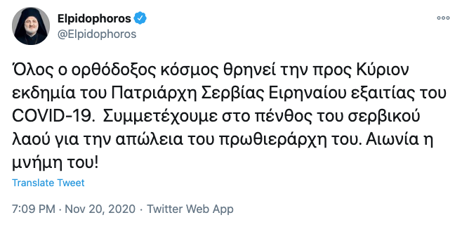 “Όλος ο ορθόδοξος κόσμος θρηνεί την προς Κύριον εκδημία του Πατριάρχη Σερβίας Ειρηναίου εξαιτίας του COVID-19. Συμμετέχουμε στο πένθος του σερβικού λαού για την απώλεια του πρωθιεράρχη του. Αιωνία η μνήμη του!”, αναφέρει το μήνυμα του Σεβασμιωτάτου.