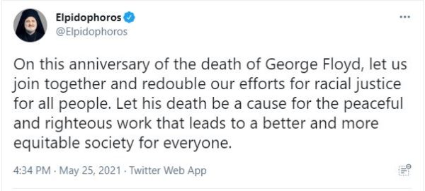 Ο Σεβασμιώτατος με επίκαιρη ανάρτησή του σημείωσε “Σε αυτή την επέτειο του θανάτου του Τζωτζ Φλόιντ, ας ενωθούμε όλοι μαζί και ας διπλασιάσουμε τις προσπάθειές μας για φυλετική δικαιοσύνη για όλους τους ανθρώπους. Ας είναι ο θάνατός του η αιτία για την ειρηνική και δίκαιη εργασία που οδηγεί σε μια καλύτερη και πιο ίση κοινωνία για όλους”.