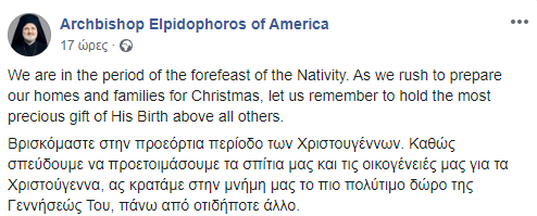 “Βρισκόμαστε στην προεόρτια περίοδο των Χριστουγέννων. Καθώς σπεύδουμε να προετοιμάσουμε τα σπίτια μας και τις οικογένειές μας για τα Χριστούγεννα, ας κρατάμε στην μνήμη μας το πιο πολύτιμο δώρο της Γεννήσεώς Του, πάνω από οτιδήποτε άλλο” ανέφερε με έμφαση στον προσωπικό του λογαριασμό σε μέσο κοινωνικής δικτύωσης ο Σεβασμιώτατος Αρχιεπίσκοπος Αμερικής κ. Ελπιδοφόρος με αφορμή την επερχόμενη μεγάλη εορτή των Χριστουγέννων που σηματοδοτεί την ρηξικέλευθη αλλαγή στην ιστορία της ανθρωπότητας.
