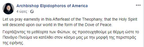 “Γιορτάζοντας τα μεθέορτα των Φώτων, ας προσευχηθούμε με θέρμη ώστε το Πανάγιο Πνεύμα να κατέλθει στον κόσμο μας με την μορφή της περιστεράς της ειρήνης”, σημείωσε σήμερα χαρακτηριστικά στον προσωπικό του λογαριασμό σε μέσο κοινωνικής δικτύωσης ο Σεβασμιώτατος Αρχιεπίσκοπος Αμερικής κ. Ελπιδοφόρος.