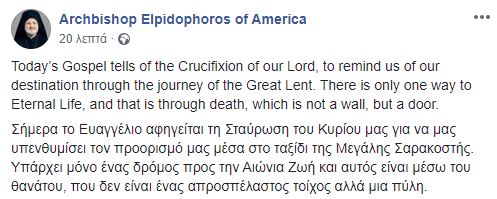 “Σήμερα το Ευαγγέλιο αφηγείται τη Σταύρωση του Κυρίου μας για να μας υπενθυμίσει τον προορισμό μας μέσα στο ταξίδι της Μεγάλης Σαρακοστής. Υπάρχει μόνο ένας δρόμος προς την Αιώνια Ζωή και αυτός είναι μέσω του θανάτου, που δεν είναι ένας απροσπέλαστος τοίχος αλλά μια πύλη” σημείωσε σήμερα χαρακτηριστικά στον προσωπικό του λογαριασμό σε μέσο κοινωνικής δικτύωσης ο Σεβασμιώτατος Αρχιεπίσκοπος Αμερικής κ. Ελπιδοφόρος τονίζοντας την μέγιστη σημασία της Μεγάλης Τεσσαρακοστής στη ζωή των πιστών.