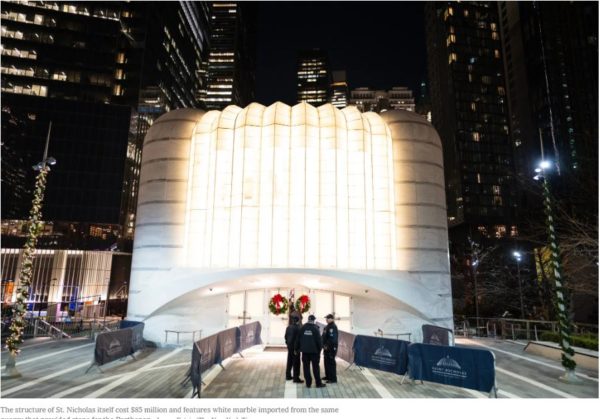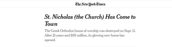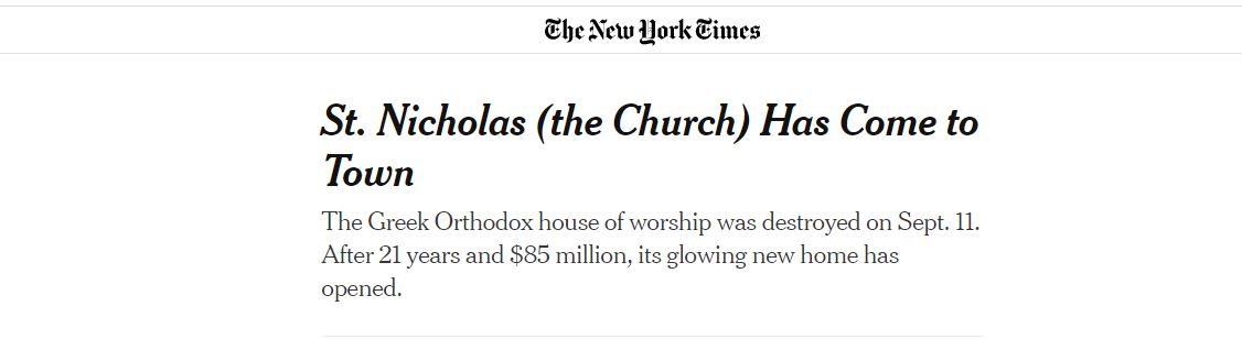 Εκτενές αφιέρωμα στο Ναό του Αγίου Νικολάου στη Νέα Υόρκη που ισοπεδώθηκε από το τρομοκρατικό χτύπημα των Διδύμων Πύργων το 2001 φιλοξενεί η αμερικάνικη εφημερίδα New York Times. “St. Nicholas (the Church) Has Come to Town”, είναι ο τίτλος του δημοσιεύματος ο οποίος κάνει λογοπαίγνιο με το δημοφιλές παιδικό Χριστουγεννιάτικο τραγούδι ‘Santa Claus is Comin’ to Town’. Το τραγούδι αναφέρεται στον Άγιο Βασίλη που φέρνει δώρα στα παιδιά (τον Άγιο Νικόλαο κατά την Ορθόδοξη Παράδοση).
