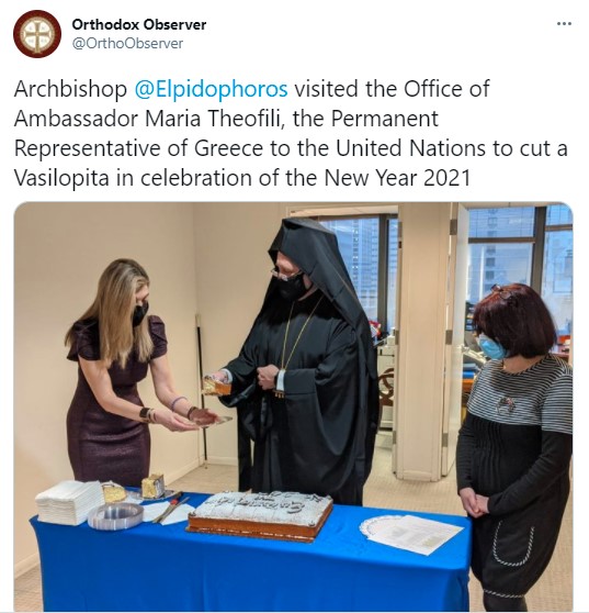 Το γραφείο της Πρέσβειρας κ. Μαρίας Θεοφίλη επισκέφτηκε ο Σεβασμιώτατος Αρχιεπίσκοπος Αμερικής κ. Ελπιδοφόρος. Ο Σεβασμιώτατος ευλόγησε και έκοψε τη βασιλόπιτα στο γραφείο της κ. Θεοφίλη η οποία είναι η Μόνιμη Αντιπρόσωπος της Ελλάδος στα Ηνωμένα Έθνη.