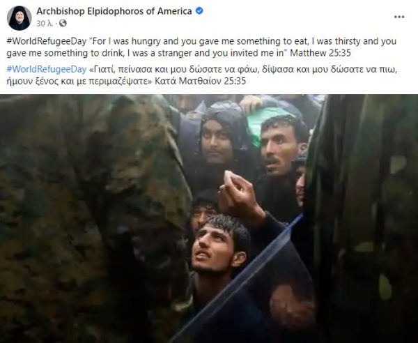 «Γιατί, πείνασα και μου δώσατε να φάω, δίψασα και μου δώσατε να πιω, ήμουν ξένος και με περιμαζέψατε» Κατά Ματθαίον 25:35. Στο ευαγγελικό χωρίo αναφέρεται ο Σεβασμιώτατος Αρχιεπίσκοπος Αμερικής κ.κ. Ελπιδοφόρος με αφορμή την Παγκόσμια Ημέρα Προσφύγων.