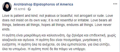 “Η αγάπη είναι μακρόθυμη και καλοσυνάτη, όχι ζηλιάρα και επιδεικτική, χωρίς αλαζονεία και αγένεια. Η αγάπη δεν είναι πεισματάρα, μνησίκακη ή ευέξαπτη. Η αγάπη όλα τα ανέχεται, σε όλα εμπιστεύεται, για όλα ελπίζει, όλα τα υπομένει. Η αγάπη ποτέ δε θα πάψει να υπάρχει” σημείωσε σήμερα χαρακτηριστικά στον προσωπικό του λογαριασμό σε μέσο κοινωνικής δικτύωσης ο Σεβασμιώτατος Αρχιεπίσκοπος Αμερικής κ. Ελπιδοφόρος τονίζοντας το νόημα και τη σημασία της πηγαίας και αυθεντικής αγάπης.