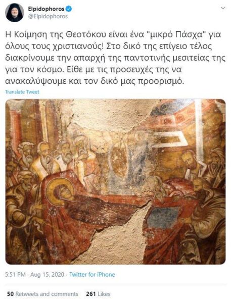 “Η Κοίμηση της Θεοτόκου είναι ένα “μικρό Πάσχα” για όλους τους χριστιανούς! Στο δικό της επίγειο τέλος διακρίνουμε την απαρχή της παντοτινής μεσιτείας της για τον κόσμο. Είθε με τις προσευχές της να ανακαλύψουμε και τον δικό μας προορισμό” αναφέρει ο Σεβασμιώτατος Αρχιεπίσκοπος Αμερικής κ. Ελπιδοφόρος σε επίκαιρη ανάρτησή του επί τη εορτή της Κοιμήσεως της Υπεραγίας Δεσποίνης ημών Θεοτόκου.