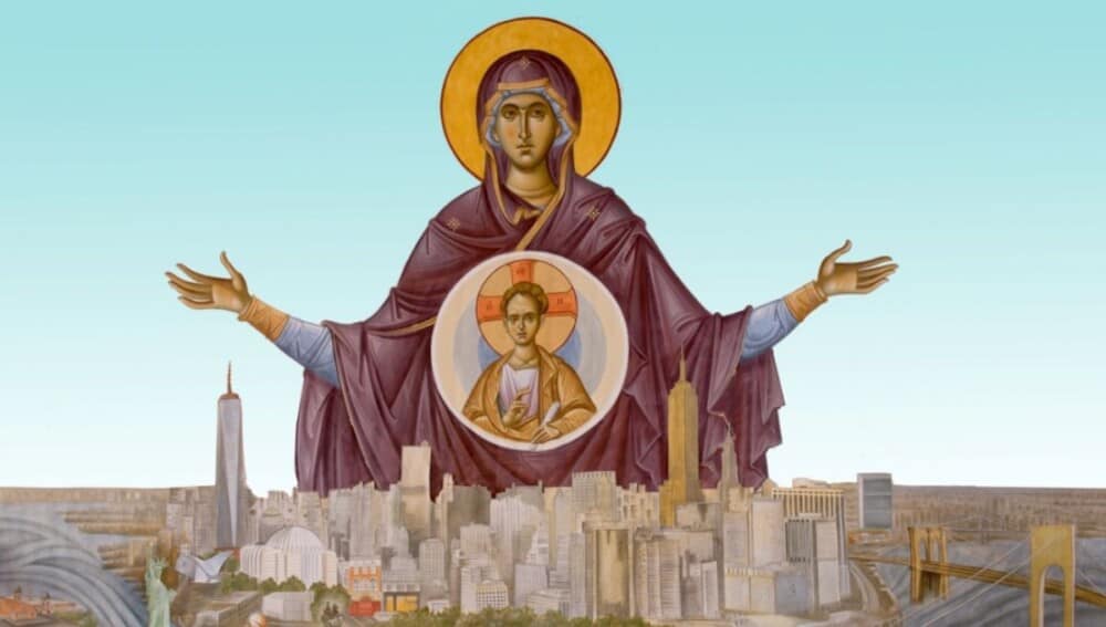 “Η Παναγία της Νέας Υόρκης”. Αυτή είναι η τοιχογραφία η οποία θα κοσμεί πλέον την αψίδα, γνωστή και ως “Πλατυτέρα των Ουρανών”, του Ελληνορθόδοξου Ιερού και Εθνικού Προσκυνηματικού Ναού του Αγίου Νικολάου στο Σημείο Μηδέν.
