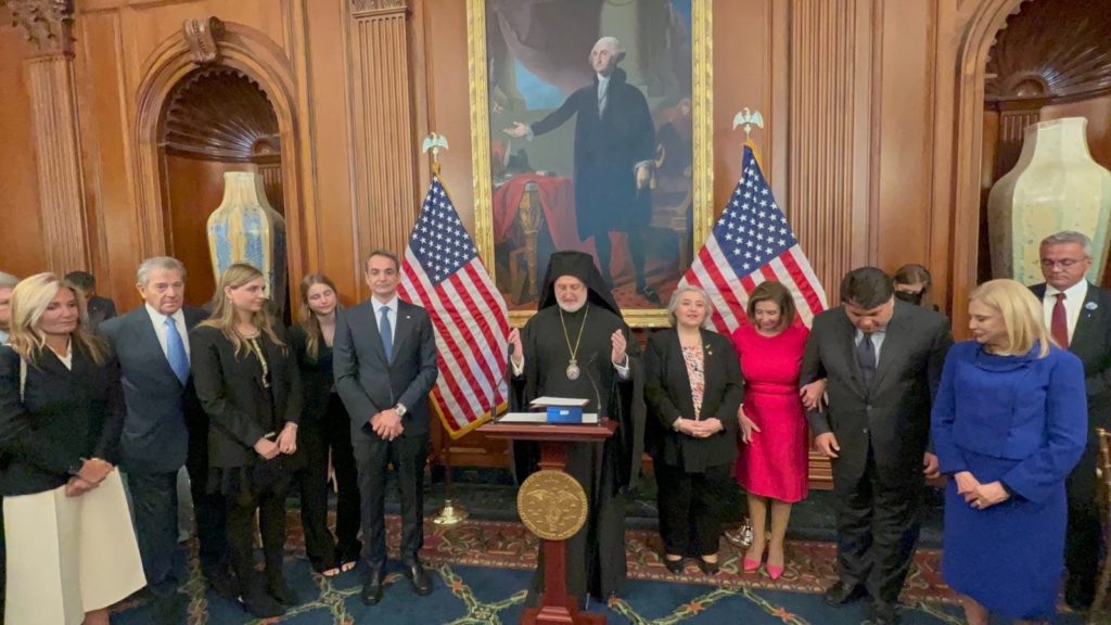 “Ιδιαίτερες ευχαριστίες σήμερα στον Παντοδύναμο Θεό, για την προνοϊκή αγάπη που ένωσε τις δύο Δημοκρατίες μας μέσα στο ιερό του Καπιτωλίου των Ηνωμένων Πολιτειών, αυτόν τον θεόπροστατευμένο Ναό της ελευθερίας και των δημοκρατικών ιδανικών. Ζητούμε την προστασία των δημοκρατιών μας, από όλους τους εχθρούς, εξωτερικούς και εσωτερικούς, και την προώθηση των θετικών σχέσεων μεταξύ Ελληνικής Δημοκρατίας και Ηνωμένων Πολιτειών της Αμερικής. Τέλος, επικαλούμαστε την ευλογία του Θεού στον Πρωθυπουργό Μητσοτάκη, την Πρόεδρο Πελόζι και όλους όσους αγωνίζονται να υπηρετήσουν τους ευγενείς Λαούς της Ελλάδας και των Ηνωμένων Πολιτειών με απεριόριστη πιστότητα στην υποχρέωση τους να είναι υπηρέτες του Λαού. Αμήν.