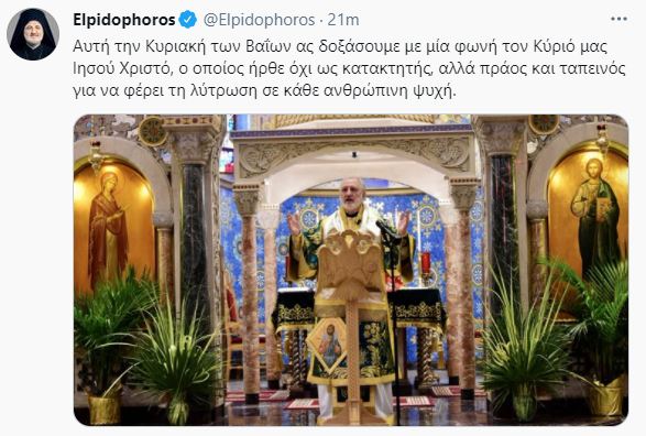 “Αυτή την Κυριακή των Βαΐων, ας δοξάσουμε με μία φωνή τον Κύριό μας Ιησού Χριστό, ο οποίος ήρθε όχι ως κατακτητής, αλλά πράος και ταπεινός για να φέρει τη λύτρωση σε κάθε ανθρώπινη ψυχή” αναφέρει ο Σεβασμιώτατος Αρχιεπίσκοπος Αμερικής κ. Ελπιδοφόρος σε επίκαιρη ανάρτησή του.