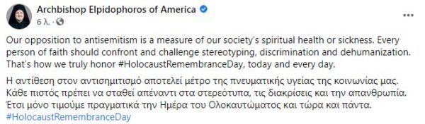 “Η αντίθεση στον αντισημιτισμό αποτελεί μέτρο της πνευματικής υγείας της κοινωνίας μας. Κάθε πιστός πρέπει να σταθεί απέναντι στα στερεότυπα, τις διακρίσεις και την απανθρωπία. Έτσι μόνο τιμούμε πραγματικά την Ημέρα του Ολοκαυτώματος και τώρα και πάντα”, γράφει.