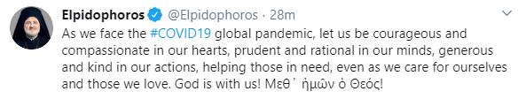 “Καθώς αντιμετωπίζουμε την παγκόσμια πανδημία COVID19, ας είμαστε γενναίοι και συμπονετικοί στις καρδιές μας, συνετοί και ορθολογικοί στο μυαλό μας, γενναιόδωροι και ευγενικοί στις ενέργειές μας, βοηθώντας αυτούς που έχουν ανάγκη, καθώς φροντίζουμε τον εαυτό μας και αυτούς τους αγαπάμε. Μεθ᾽ ἡμῶν ὁ Θεός!”