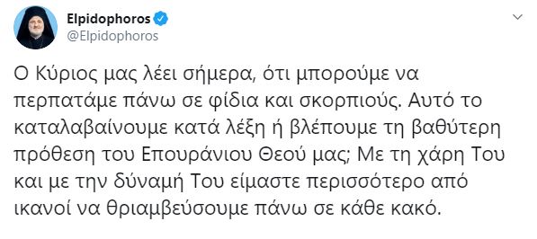 “Ο Κύριος μας λέει σήμερα, ότι μπορούμε να περπατάμε πάνω σε φίδια και σκορπιούς. Αυτό το καταλαβαίνουμε κατά λέξη ή βλέπουμε τη βαθύτερη πρόθεση του Επουράνιου Θεού μας; Με τη χάρη Του και με την δύναμή Του είμαστε περισσότερο από ικανοί να θριαμβεύσουμε πάνω σε κάθε κακό”.