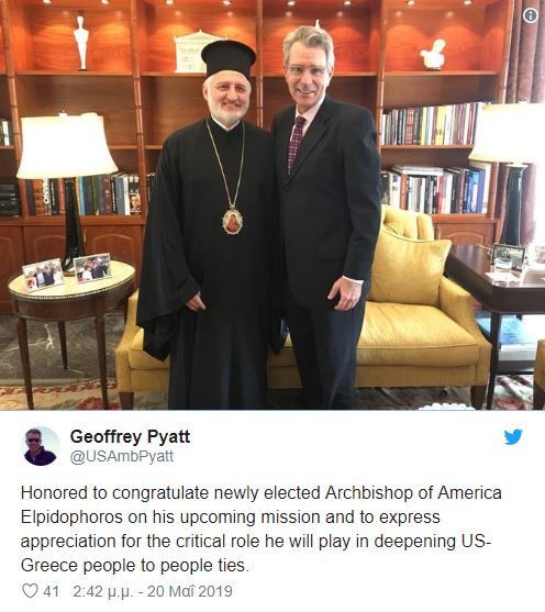 Με τον νέο Αρχιεπίσκοπο Αμερικής κ. Ελπιδοφόρο, συναντήθηκε σήμερα ο Αμερικανός πρέσβης στην Ελλάδα, Τζέφρι Πάιατ. Μέσω του προσωπικού του λογαριασμού στο Twitter, ο Αμερικανός πρέσβης ενημέρωσε ότι συνεχάρη τον νεοεκλεγέντα Αρχιεπίσκοπο και του εξέφρασε την εκτίμησή του για τον κρίσιμο, όπως είπε ρόλο «που θα παίξει στην εμβάθυνση των σχέσεων ανάμεσα στους πολίτες των ΗΠΑ και της Ελλάδας”.