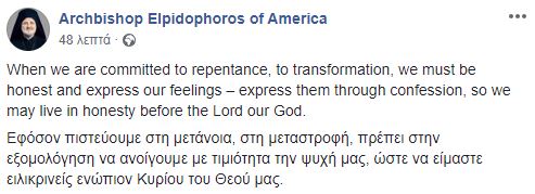 “Εφόσον πιστεύουμε στη μετάνοια, στη μεταστροφή, πρέπει στην εξομολόγηση να ανοίγουμε με τιμιότητα την ψυχή μας, ώστε να είμαστε ειλικρινείς ενώπιον Κυρίου του Θεού μας” σημείωσε σήμερα χαρακτηριστικά στον προσωπικό του λογαριασμό σε μέσο κοινωνικής δικτύωσης ο Σεβασμιώτατος Αρχιεπίσκοπος Αμερικής κ. Ελπιδοφόρος τονίζοντας τη σπουδαία της εομολόγησης στη ζωή των πιστών.