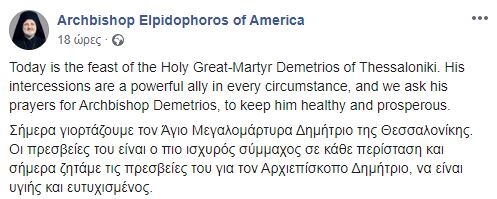 Αργότερα σε μήνυμά του σε μέσο κοινωνικής δικτύωσης αναφέρθηκε και στον εορτάζοντα (χθες) Αρχιεπίσκοπο πρώην Αμερικής κ. Δημήτριο λέγοντας χαρακτηριστικά, “Σήμερα γιορτάζουμε τον Άγιο Μεγαλομάρτυρα Δημήτριο της Θεσσαλονίκης. Οι πρεσβείες του είναι ο πιο ισχυρός σύμμαχος σε κάθε περίσταση και σήμερα ζητάμε τις πρεσβείες του για τον Αρχιεπίσκοπο Δημήτριο, να είναι υγιής και ευτυχισμένος”.