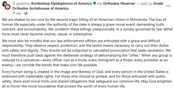 Με αφορμή τον θανάσιμο πυροβολισμό του 37χρονου νοσηλευτή Άλεξ Πρέτι από ομοσπονδιακούς πράκτορες στη Μινεάπολη —το δεύτερο θανατηφόρο περιστατικό μέσα στον Ιανουάριο του 2026 μετά τον θάνατο της Ρενέ Γκουν— ο Αρχιεπίσκοπος Αμερικής κ. Ελπιδοφόρος παρεμβαίνει με ηχηρό μήνυμα σε μέσο κοινωνικής δικτύωσης, καταδικάζοντας απερίφραστα τη χρήση θανατηφόρας βίας και καλώντας σε αυτοσυγκράτηση, αλήθεια και ανάληψη ευθυνών.