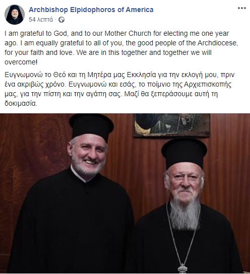 “Ευγνωμονώ το Θεό και τη Μητέρα μας Εκκλησία για την εκλογή μου, πριν ένα ακριβώς χρόνο. Ευγνωμονώ και εσάς, το ποίμνιο της Αρχιεπισκοπής μας, για την πίστη και την αγάπη σας. Μαζί θα ξεπεράσουμε αυτή τη δοκιμασία” γράφει.