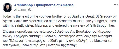 “Σήμερα γιορτάζουμε τον νεώτερο αδελφό του Αγ. Βασιλείου του Μεγάλου, τον Άγ. Γρηγόριο Νύσσης. Ενόσω ο μεγαλύτερος σπούδαζε την Ακαδημία του Πλάτωνος, ο νεώτερος σπούδαζε με την αγία αδελφή του Μακρίνα και εισερχόταν, μέσω αυτής, στο μυστήριο της πίστης” σημείωσε σήμερα με έμφαση στον προσωπικό του λογαριασμό σε μέσο κοινωνικής δικτύωσης ο Σεβασμιώτατος Αρχιεπίσκοπος Αμερικής κ. Ελπιδοφόρος με αφορμή τη σημερινή εορτή του αδελφού του Μεγάλου Βασιλείου, Αγίου Γεωργίου Νύσσης.