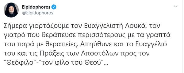 “Σήμερα (σ.σ. χθες), γιορτάζουμε τον Ευαγγελιστή Λουκά, τον γιατρό που θεράπευσε περισσότερους με τα γραπτά του παρά με θεραπείες. Απηύθυνε και το Ευαγγέλιό του και τις Πράξεις των Αποστόλων προς τον “Θεόφιλο”- “τον φίλο του Θεού”. Όλοι, είμαστε καλεσμένοι να γίνουμε φίλοι του Θεού και να μεταμορφωθούμε από τα λόγια του”.