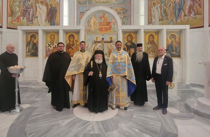 Ο Σεβασμιώτατος παρέστη συμπροσευχόμενος κατά τη Θεία Λειτουργία. Ο Προϊστάμενος του ναού, Πρωτοπρεσβύτερος π. Ανδρέας Βυθούλκας, καλωσόρισε με θερμά λόγια τον Αρχιεπίσκοπο Σινά και αναφέρθηκε στο πρόσφατο ταξίδι που είχε πραγματοποιήσει η Ιερά Αρχιεπισκοπή στο Θεοβάδιστο Όρος.