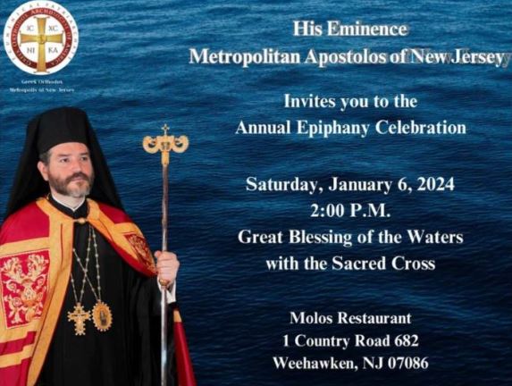 Ο Σεβασμιώτατος απευθύνει κάλεσμα προς τους κληρικούς και λαϊκούς από την βόρεια Περιφέρεια της Νέας Ιερσέης να συμμετάσχουν στον ετήσιο εορτασμό των Θεοφανείων και τον Αγιασμό των Υδάτων το Σάββατο 6 Ιανουαρίου 2024 στο εστιατόριο Molos στο Weehawken.