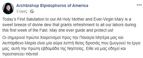 “Οι σημερινοί πρώτοι Χαιρετισμοί προς την Παναγία Μητέρα μας και Αειπάρθενο Μαρία είναι μία αύρα λεπτή θείας δροσιάς που ζωογονεί τα έργα μας, αυτή την πρώτη εβδομάδα της Νηστείας. Είθε να μας οδηγεί και προστατεύει πάντα!” σημείωσε σήμερα χαρακτηριστικά στον προσωπικό του λογαριασμό σε μέσο κοινωνικής δικτύωσης ο Σεβασμιώτατος Αρχιεπίσκοπος Αμερικής κ. Ελπιδοφόρος τονίζοντας τη σπουδαία σημασία των ημερών που διανύουμε στη ζωή της Εκκλησίας.