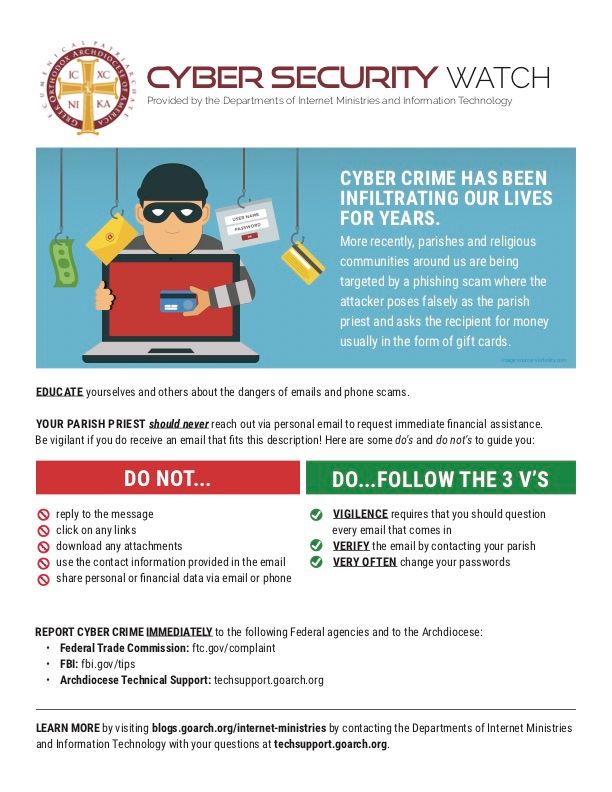 Εκστρατεία ενημέρωσης ενάντια στο Ηλεκτρονικό Έγκλημα ξεκινά η Αρχιεπισκοπή Αμερικής, μετά τα τελευταία κρούσματα που παρουσιάστηκαν με επιτήδειους που προφασιζόμενοι ότι είναι ιερείς ή εκπρόσωποι της Εκκλησίας στέλνουν email ζητώντας χρήματα.