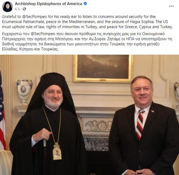 “Ευχαριστώ τον κ. Πομπέο που άκουσε πρόθυμα τις ανησυχίες μας για το Οικουμενικό Πατριαρχείο, την ειρήνη στη Μεσόγειο, και την Αγ.Σοφία. Ζητάμε οι ΗΠΑ να υποστηρίξουν τη διεθνή νομιμότητα, τα δικαιώματα των μειονοτήτων στην Τουρκία, την ειρήνη μεταξύ Ελλάδας, Κύπρου και Τουρκίας” ανέφερε ο Σεβασμιώτατος Αρχιεπίσκοπος Αμερικής κ. Ελπιδοφόρος σε επίκαιρη ανάρτησή του, μετα τη συνάντηση του με τον Υπουργό Εξωτερικών των Ηνωμένων Πολιτειών, κ. Μάικ Πομπέο, κατά το πρωινό της 24ης Σεπτεμβρίου.