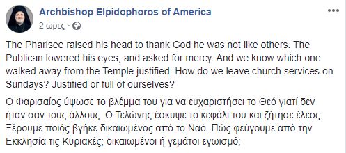 09/02/2020 09/02/2020 “Ο Φαρισαίος ύψωσε το βλέμμα του για να ευχαριστήσει το Θεό, γιατί δεν ήταν σαν τους άλλους. Ο Τελώνης έσκυψε το κεφάλι του και ζήτησε έλεος” αναφέρει ο Σεβασμιώτατος Αρχιεπίσκοπος Αμερικής, κ. Ελπιδοφόρος, σε επίκαιρη ανάρτησή του. “Ξέρουμε, ποιός βγήκε δικαιωμένος από το Ναό. Πώς φεύγουμε από την Εκκλησία τις Κυριακές; Δικαιωμένοι ή γεμάτοι εγωϊσμό;”....