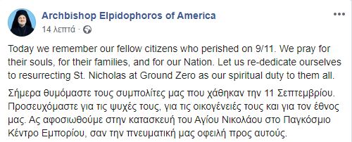 “Σήμερα θυμόμαστε τους συμπολίτες μας που χάθηκαν την 11 Σεπτεμβρίου. Προσευχόμαστε για τις ψυχές τους, για τις οικογένειές τους και για το έθνος μας. Ας αφοσιωθούμε στην κατασκευή του Αγίου Νικολάου στο Παγκόσμιο Κέντρο Εμπορίου, σαν την πνευματική μας οφειλή προς αυτούς” ανέφερε με έκδηλη συγκίνηση στον προσωπικό του λογαριασμό σε μέσο κοινωνικής δικτύωσης (facebook) πριν από λίγο ο Σεβασμιώτατος Αρχιεπίσκοπος Αμερικής κ. Ελπιδοφόρος με αφορμή τη σημερινή “μαύρη” επέτειο των τρομοκρατικών χτυπημάτων στις 11 Σεπτεμβρίου 2001 που στοίχισε τη ζωή σε 2.973 συνανθρώπους μας.