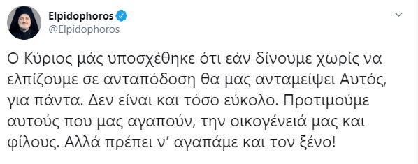 “Ο Κύριος μάς υποσχέθηκε ότι εάν δίνουμε χωρίς να ελπίζουμε σε ανταπόδοση θα μας ανταμείψει Αυτός, για πάντα” γράφει ο Σεβ. Αρχιεπίσκοπος Αμερικής, κ. Ελπιδοφόρος, σε σημερινή ανάρτησή του. “Δεν είναι και τόσο εύκολο. Προτιμούμε αυτούς που μας αγαπούν, την οικογένειά μας και φίλους. Αλλά πρέπει ν’ αγαπάμε και τον ξένο!”.