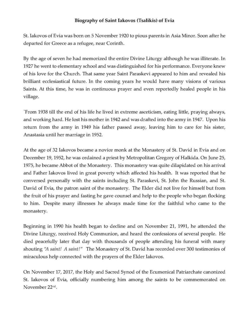 «Ταξίδευα προ καιρού και ευρισκόμουν στην Ινδία. Κάποια μέρα αντιμετώπισα σοβαρό πρόβλημα με την καρδιά μου Στο Νοσοκομείο εκεί που με πήγαν οι γιατροί είπαν στους συναδέλφους μου ότι τελειώνω. Εγώ, παρ΄ όλο που ήμουν σε κωματώδη κατάσταση, ένιωθα ότι κάποια αόρατη θεία δύναμη με βοηθάει. Όταν αργότερα άνοιξα κά­ποια στιγμή τα μάτια μου τον πρώτο που είδα μπροστά μου ήταν ο Γέροντας Ιάκωβος που είχα διαβάσει αρκετές φορές το βιβλίο του. Μου είπε: «Μή φοβάσαι, κύριε Γιαννούλη, θα σε βοηθήσω, θα γίνεις τελείως καλά και θα ξαναγυρίσεις στην πατρίδα». Και από εκείνης της ώρας πράγματι έγινα τελείως καλά».