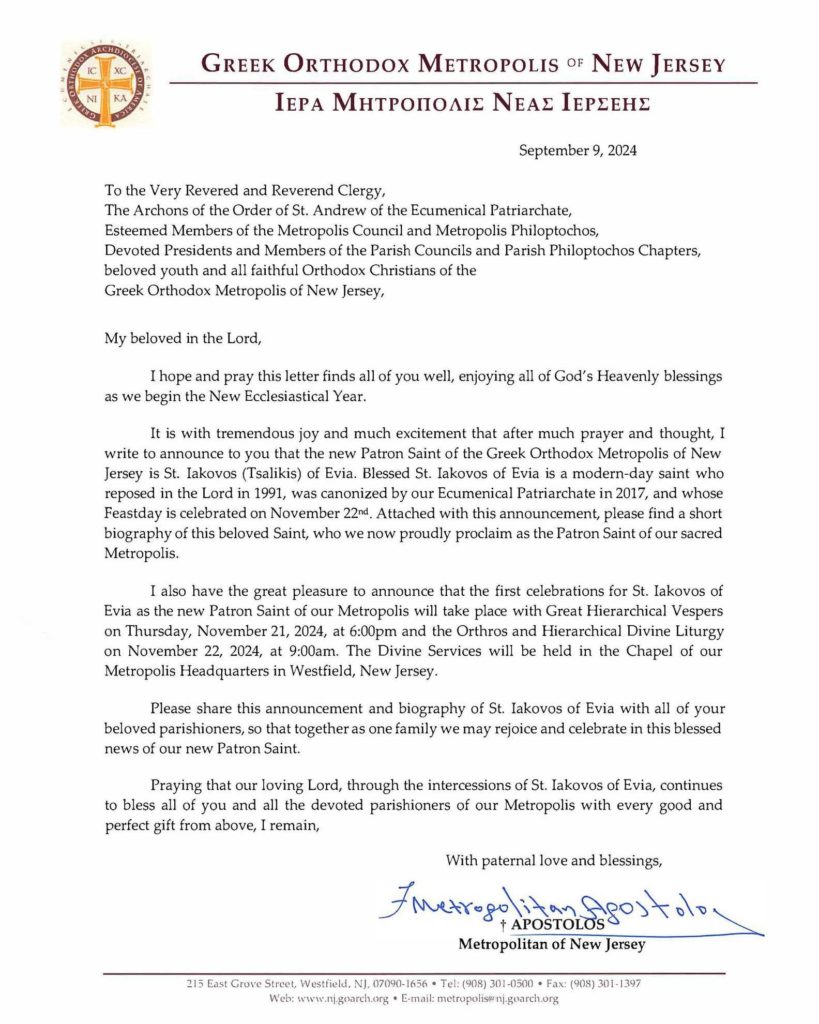 19/09/2024 21/09/2024 Ο Άγιος Ιάκωβος Τσαλίκης ανακηρύχθηκε ο νέος Προστάτης της Ιεράς Μητροπόλεως Νέας Ιερσέης, όπως ανακοίνωσε ο Ποιμενάρχης της, Σεβασμιώτατος Μητροπολίτης κ. Απόστολος. Σε μήνυμα που εξέδωσε την περασμένη εβδομάδα, ο Σεβασμιώτατος έκανε γνωστό επίσης το πρόγραμμα του επερχόμενου πρώτου εορτασμού της μνήμης του Προστάτη Αγίου στην καθέδρα της Ιεράς Μητροπόλεως στο Ουέστφιλντ του Νιου Τζέρσεϊ....