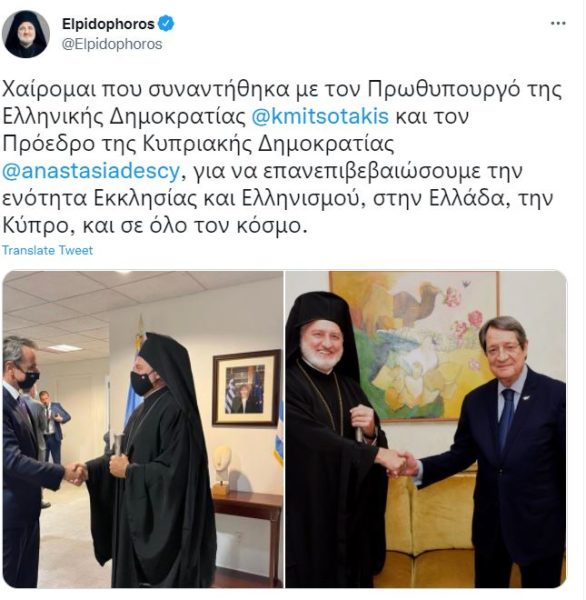 Από την πλευρά του ο Σεβασμιώτατος Αρχιεπίσκοπος Αμερικής κ. Ελπιδοφόρος, με σημερινή ανάρτηση (25/9) του σε μέσο κοινωνικής δικτύωσης εκφράζει την ικανοποίηση του για τις συναντήσεις που είχε τόσο με τον Έλληνα πρωθυπουργό Κυριάκο Μητσοτάκη όσο και με τον Πρόεδρο της Κυπριακής Δημοκρατίας Νίκο Αναστασιάδη, τονίζοντας παράλληλα την επανεπιβεβαίωση της ενότητας Εκκλησίας και Ελληνισμού.