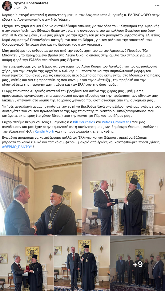 Με ανάρτηση στον προσωπικό του λογαριασμό σε μέσο κοινωνικής δικτύωσης ο Δήμαρχος Θέρμου Σπύρος Κωνσταντάρας αναφέρεται στο ταξίδι του στις Ηνωμένες Πολιτείες Αμερικής χαρακτηρίζοντας ως ≈κορυφαία στιγμή» τη συνάντηση με τον Αρχιεπίσκοπο Αμερικής κ. Ελπιδοφόρο στη Νέα Υόρκη και, μεταξύ άλλων, προσθέτει:
