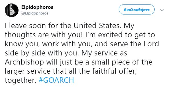 “Αναχωρώ σύντομα για τις Ηνωμένες Πολιτείες. Οι σκέψεις μου είναι μαζί σας! Είμαι ενθουσιασμένος που θα σας γνωρίσω, θα εργαστώ μαζί σας και θα υπηρετήσω τον Κύριο στο πλευρό σας. Η υπηρεσία μου ως Αρχιεπίσκοπος θα είναι απλά ένα μικρό κομμάτι της μεγαλύτερης υπηρεσίας που προσφέρουν όλοι οι πιστοί μαζί. #GOARCH