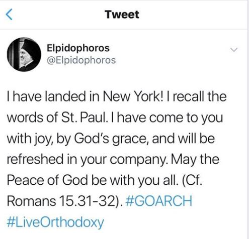 Με ένα μήνυμα στο twitter ανακοίνωσε την άφιξη του στο αεροδρόμιο Κένεντι της Νέας Υόρκη, ο νέος Αρχιεπίσκοπος Αμερικής, κ. Ελπιδοφόρος.
